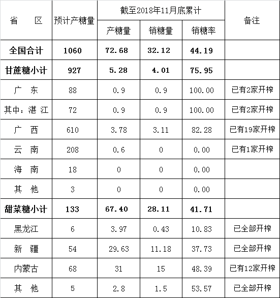 截至2018年11月底,本制糖期全國累計銷售食糖32.12萬噸(上制糖期同期30.22萬噸),累計銷糖率44.19%(上制糖期同期45.02%),其中,銷售甘蔗糖4.01萬噸(上制糖期同期3.23萬噸),銷糖率75.95%(上制糖期同期65.38%),銷售甜菜糖28.11萬噸(上制糖期同期26.99萬噸),銷糖率41.71%(上制糖期同期43.4%)(見附表)。